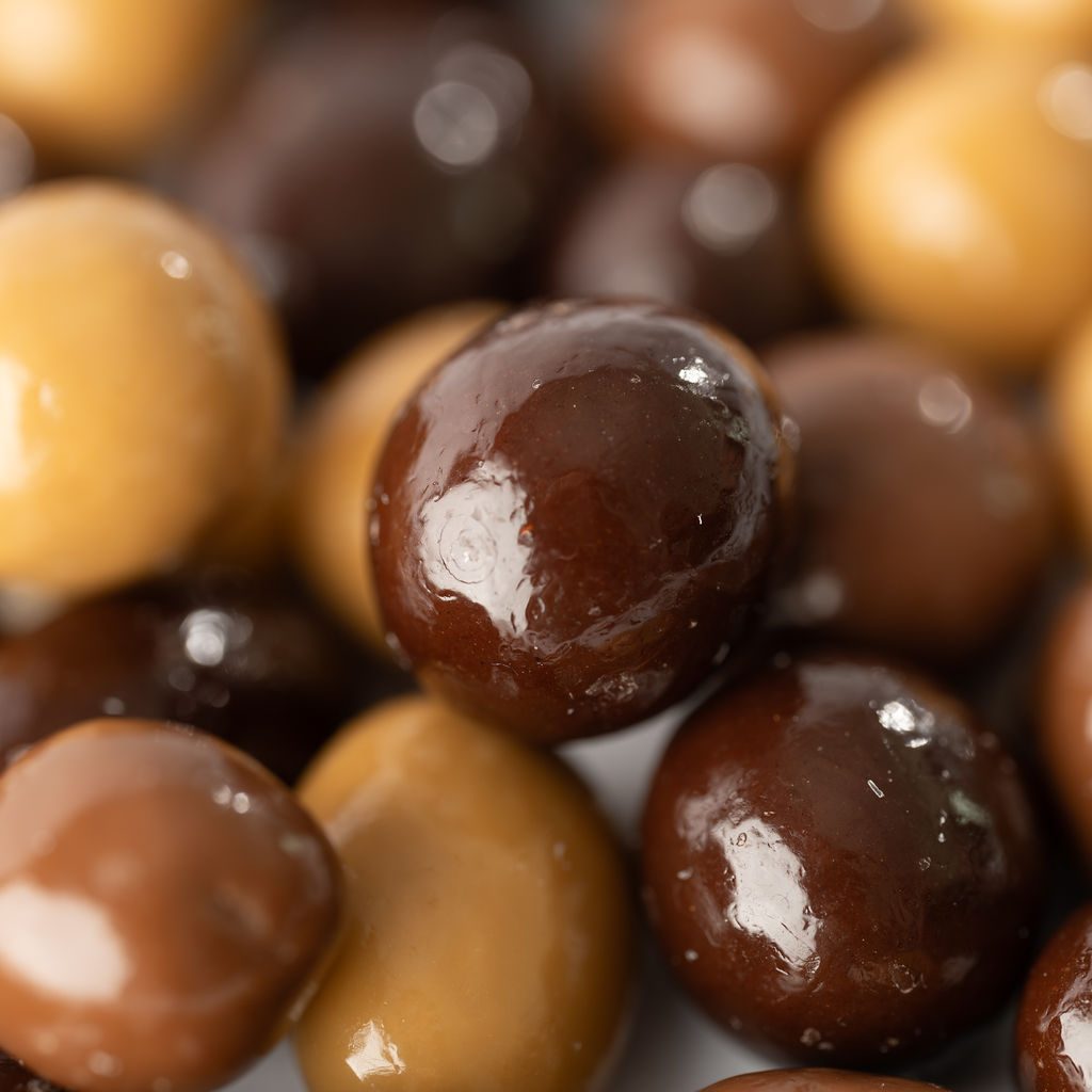 Billes croustillantes enrobées aux chocolat noir, chocolat au lait, dulcey